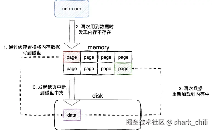 但是随着发展,计算机需要运行的内存越来越多,内存空间有些捉襟见肘了,于是设计者提出了LRU缓存置换算法,该算法将最近没有用到的内存数据置换到硬盘空间以容纳新的进程内存分配需求,当cpu实际再次访问到这个数据的时候,操作系统会优先从内存中尝试加载数据,若没有数据则发起缺页中断将数据重新加载回内存中,这也就是著名的内存分页交换算法: