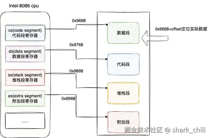 - CPU通过段寄存器中的段基址加上偏移量进行寻址