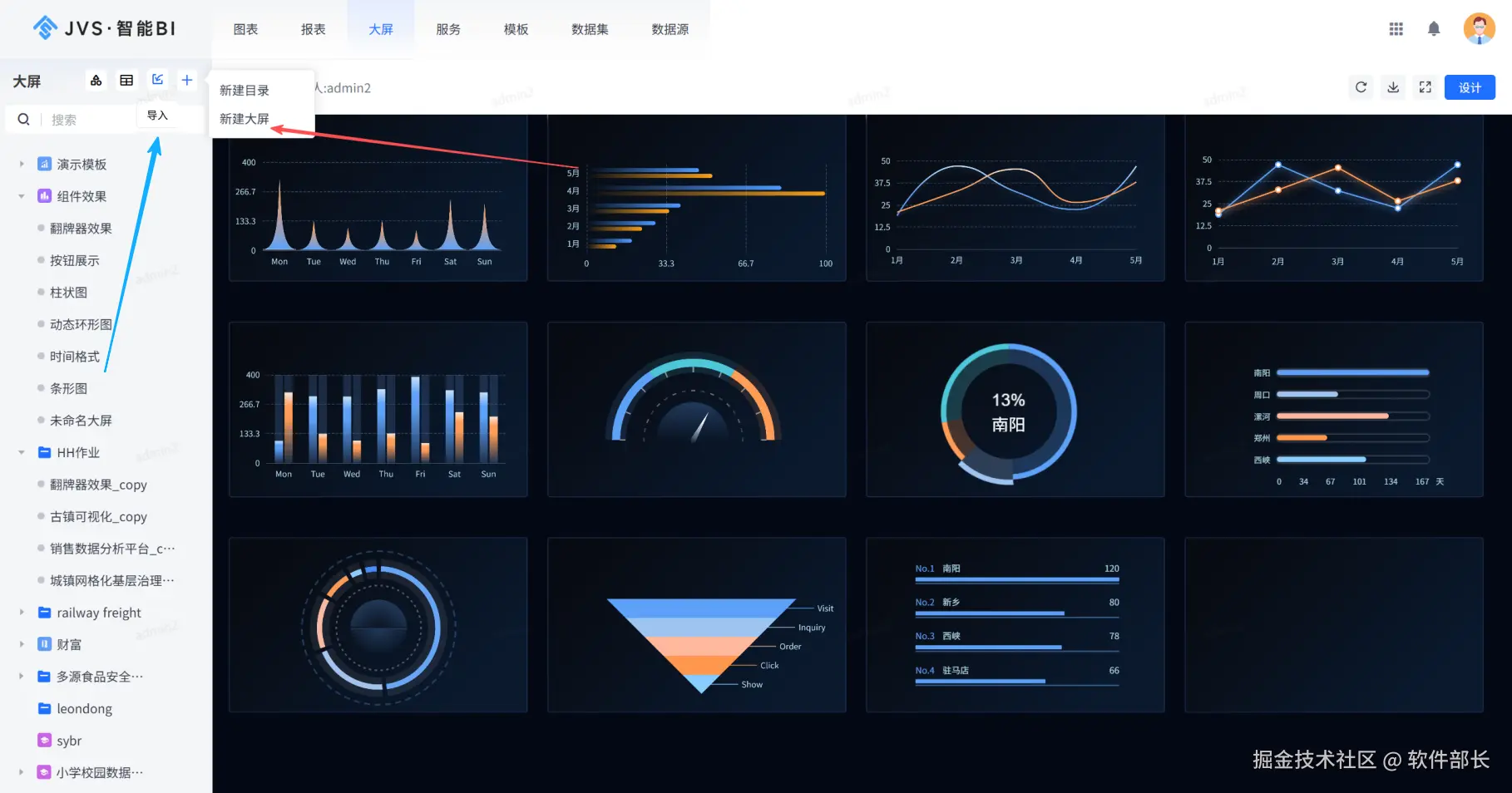 ①.新建大屏:创建空白的大屏,从零开始搭建个性化大屏。