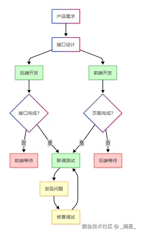 在传统的前后端协作模式中,我们经常遇到以下问题:图1:传统开发模式流程图 - 展示前后端相互等待的问题