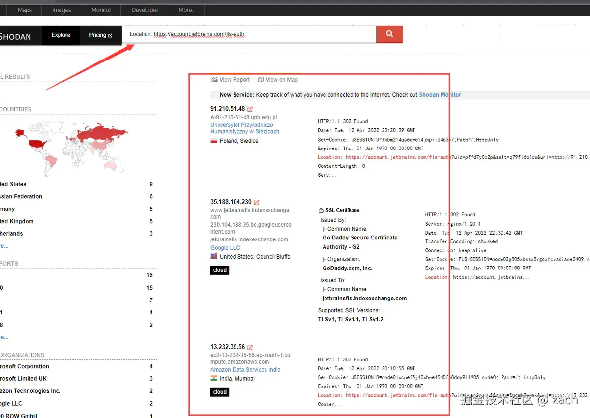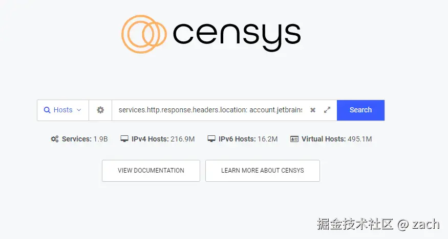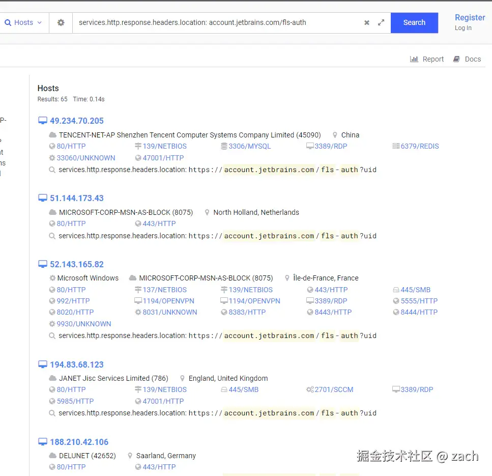 我们将上面这串代码services.http.response.headers.location: account.jetbrains.com/fls-auth复制进censys搜索框中进行搜索,会出现: