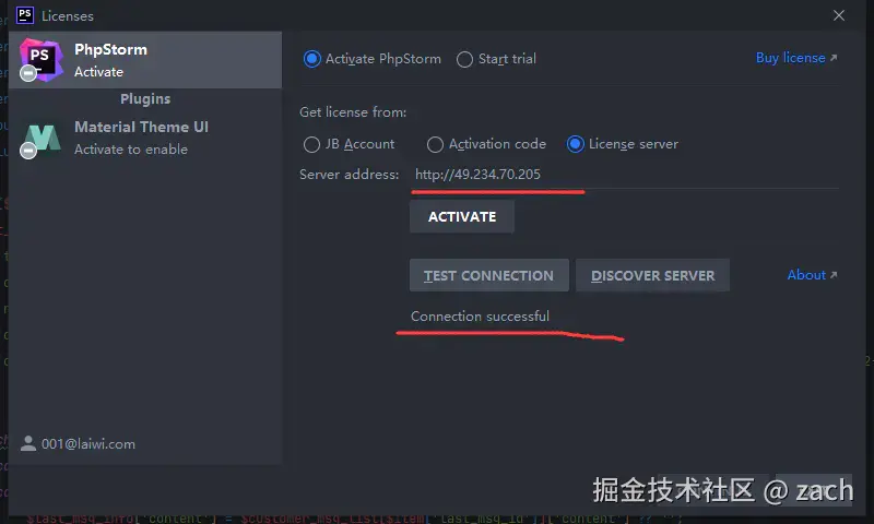 然后我们复制域名或者IP到jetbrains全家桶进行激活,比如我们使用第一个 49.234.70.205 复制到 License server 。
