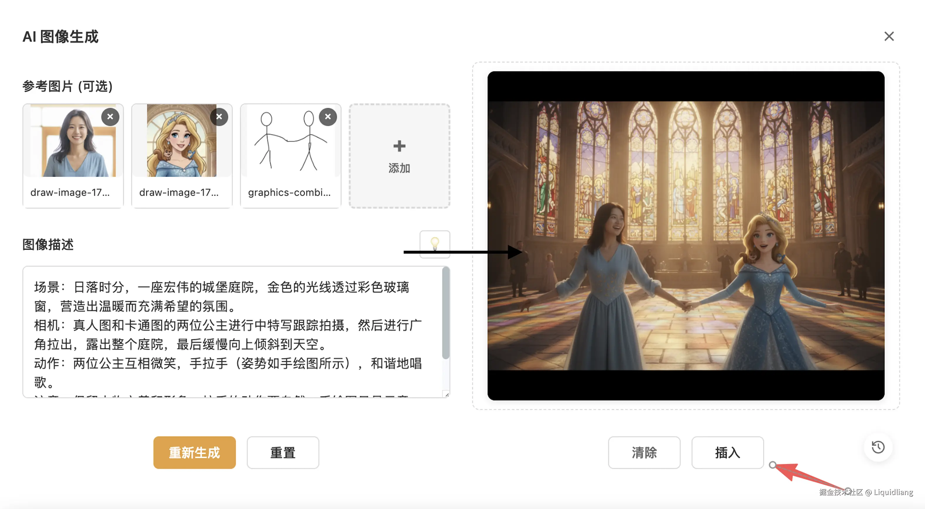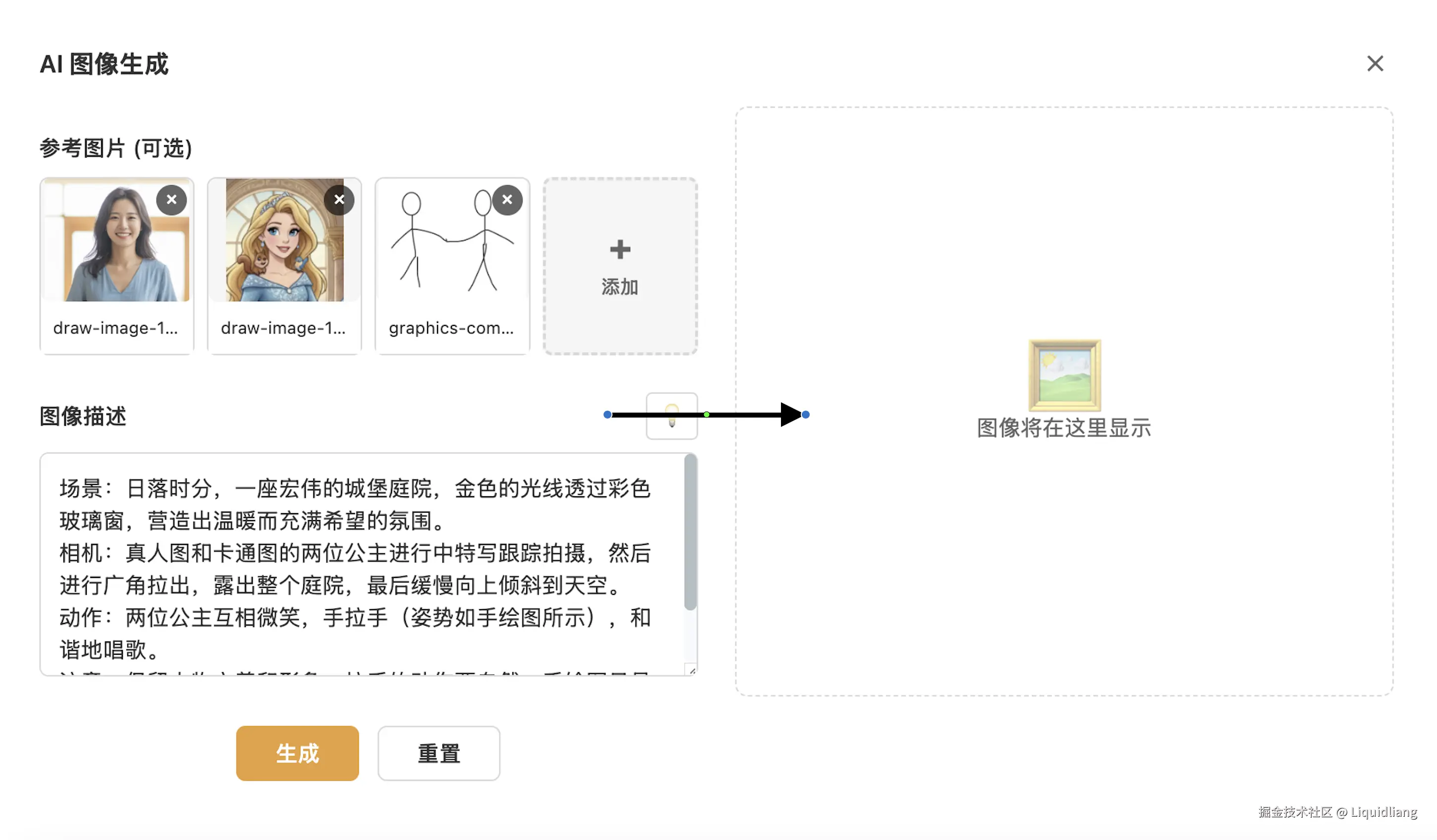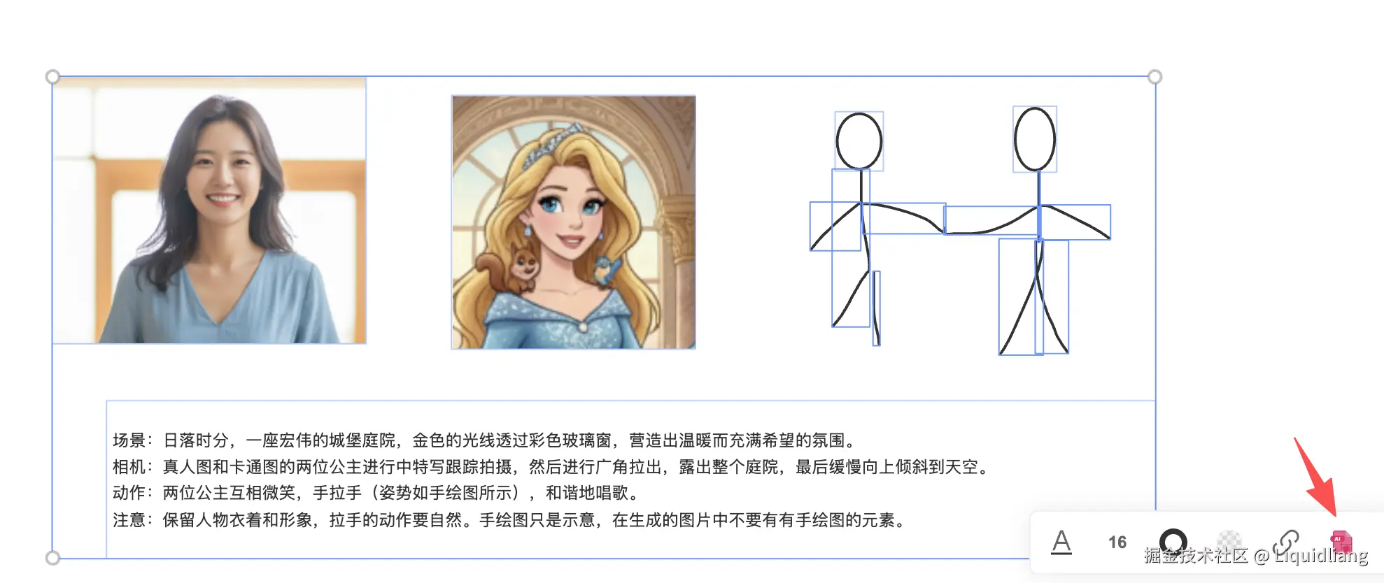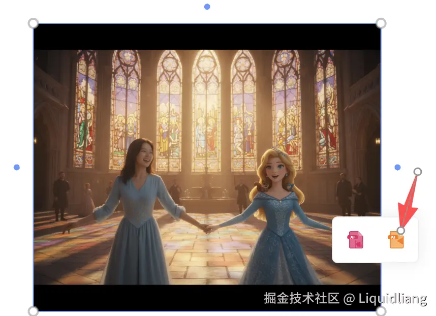 - 快速选择画板上的多个图片元素,显示AI 图片生成按钮,点击,自动填充到表单
