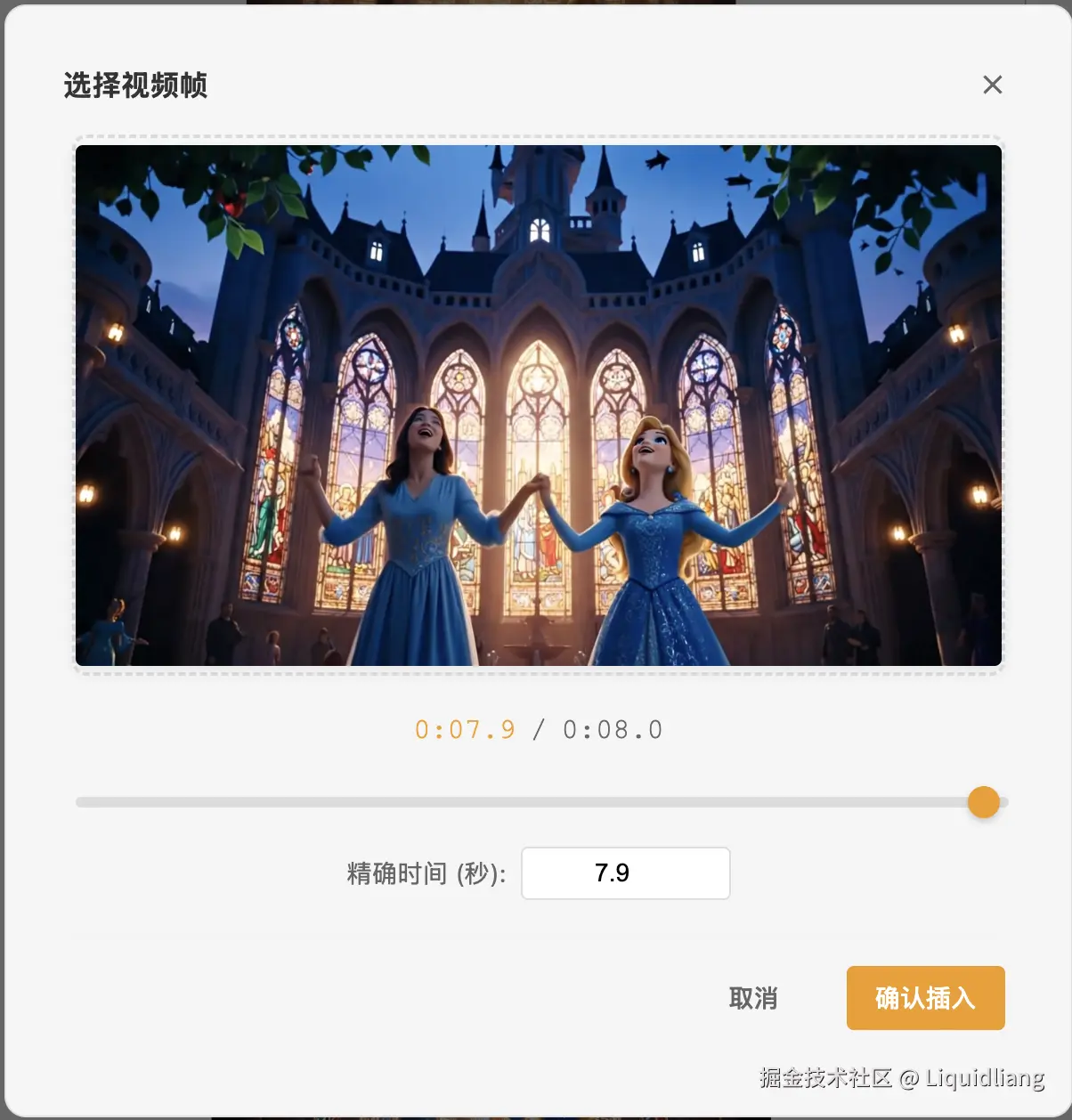 2.默认选择最后一帧图片显示在弹窗上方,下面可以拖动进度或者输入进准定位到对应时间的帧