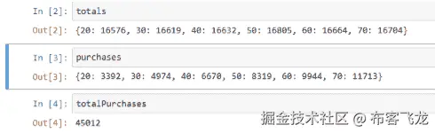 这段代码最终的作用是使用 NumPy 的random.choice()函数随机将每个人分配到一个年龄组。然后我将分配购买东西的概率,并且我已经加权,使得年轻人购买东西的可能性小于老年人。我将遍历 10 万人,并在遍历过程中将所有东西加起来,最终得到两个 Python 字典:一个给出了每个年龄组的总人数,另一个给出了每个年龄组内购买的总数。我还将跟踪总体购买的总数。让我们运行这段代码。