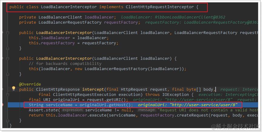 显然有人帮 根据service名称,获取到了服务实例的ip和端口。它就是LoadBalancerInterceptor,这个类会在对RestTemplate的请求进行拦截,然后从Eureka根据服务id获取服务列表,随后利用负载均衡算法得到真实的服务地址信息,替换服务id。