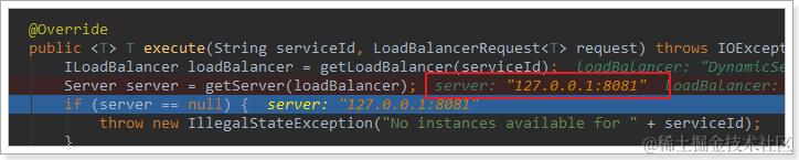 - getServer(loadBalancer):利用内置的负载均衡算法,从服务列表中选择一个。本例中,可以看到获取了8082端口的服务
