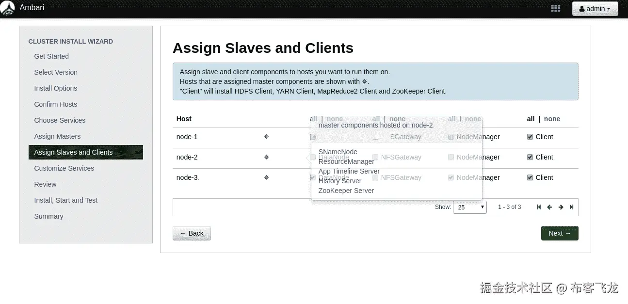 在这里,我们可以选择为安装的组件选择需要从属节点和客户端的节点。我留下了已经为我选择的选项:
