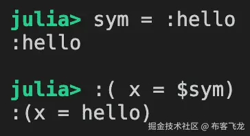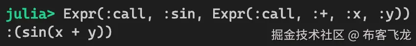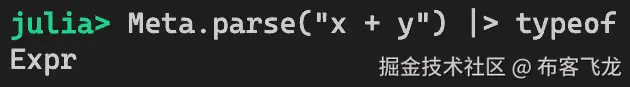 在 Julia 中,每个表达式都表示为一个Expr对象。我们可以通过使用Meta.parse函数解析一个字符串来创建一个Expr对象。
