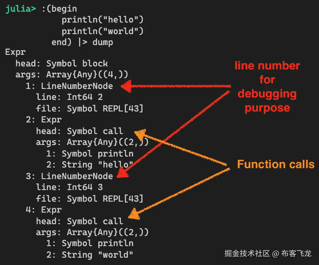 头节点只包含一个 block 符号。当块中有多行时,抽象语法树也包括行号节点。在这个例子中,有一个 LineNumberNode 在 println 的第一次调用之前,行号为 2。同样,还有一个 LineNumberNode 在 println 的第二次调用之前,行号为 3。LineNumberNode 节点不做任何事情,但它们对于堆栈跟踪和调试很有用。