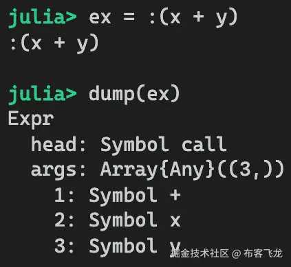 因为抽象语法树只是一个数据结构,我们可以在 Julia 的 REPL 环境中直接检查它。让我们从一个简单的表达式开始:x + y:
