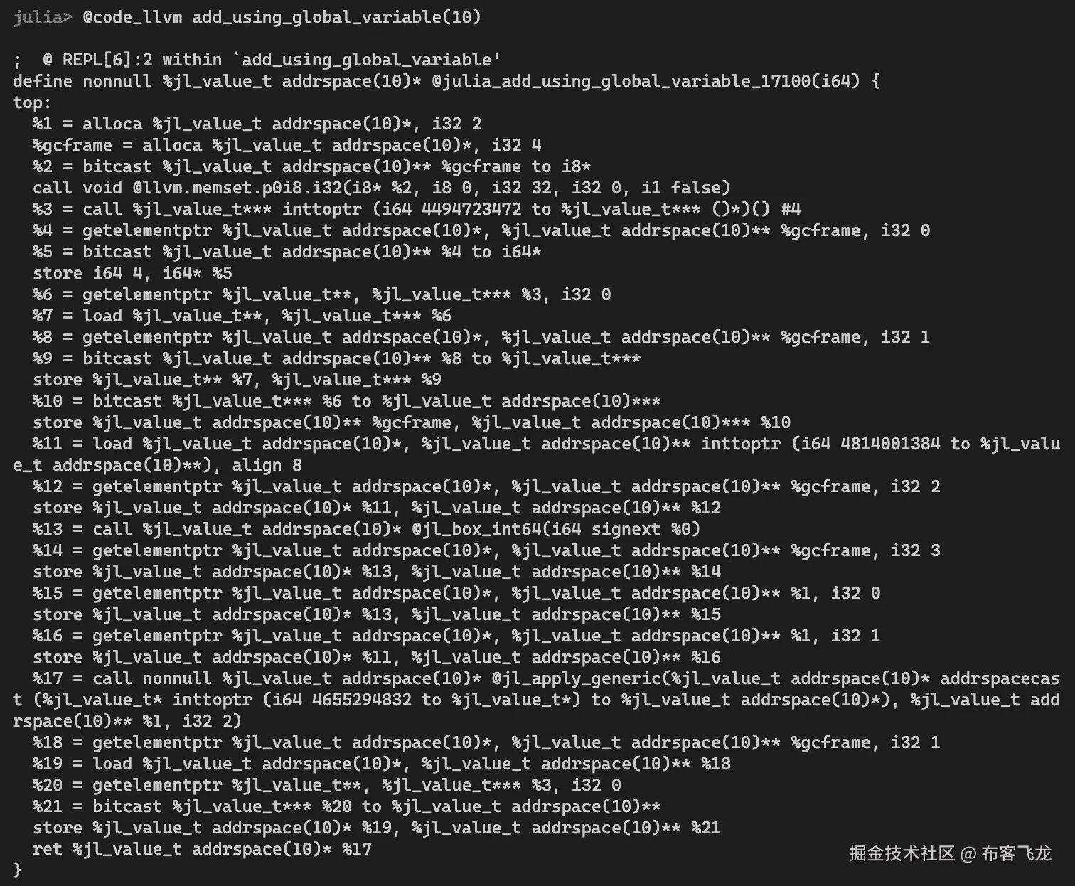 @code_warntype宏显示了代码的中间表示(IR)。编译器在理解了代码中每一行的流程和数据类型后,会生成一个 IR。对于我们这里的用途,我们不需要理解屏幕上打印出的所有内容,但我们可以关注与代码生成数据类型相关的突出文本。一般来说,当你看到红色文本时,它也会是一个红色的警告标志。