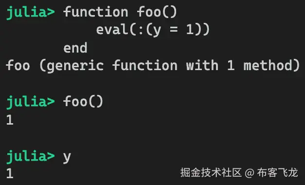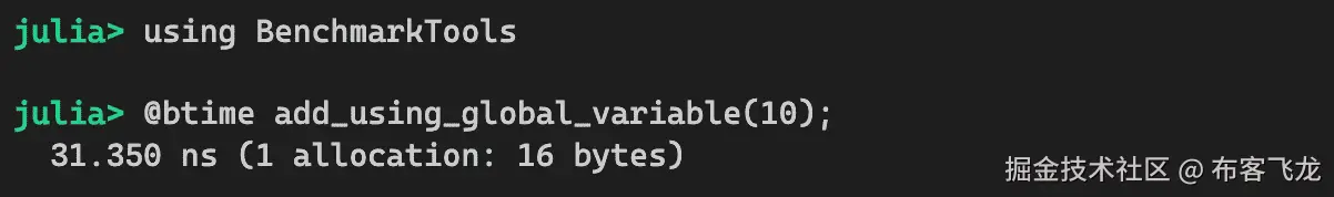 当一个函数被调用时,其参数的类型是已知的,然后函数会根据其参数的确切数据类型进行编译。这被称为专业化。那么什么是屏障函数呢?它只是简单地利用 Julia 的函数专业化来稳定变量类型,作为函数调用的一部分。我们将继续前面的例子来说明这项技术。