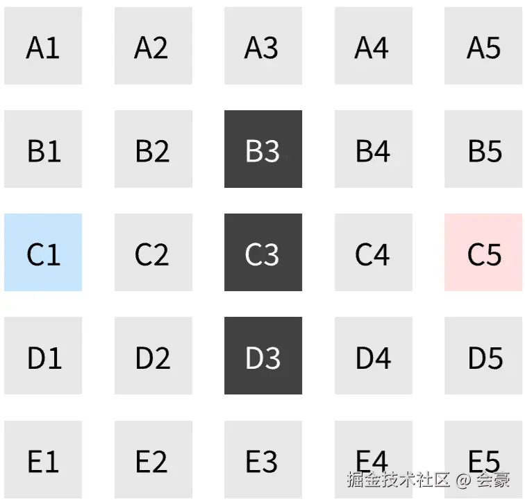 "A4": { "x": 0, "y": 3, "connections": ["A3", "A5", "B4", "B5"] },