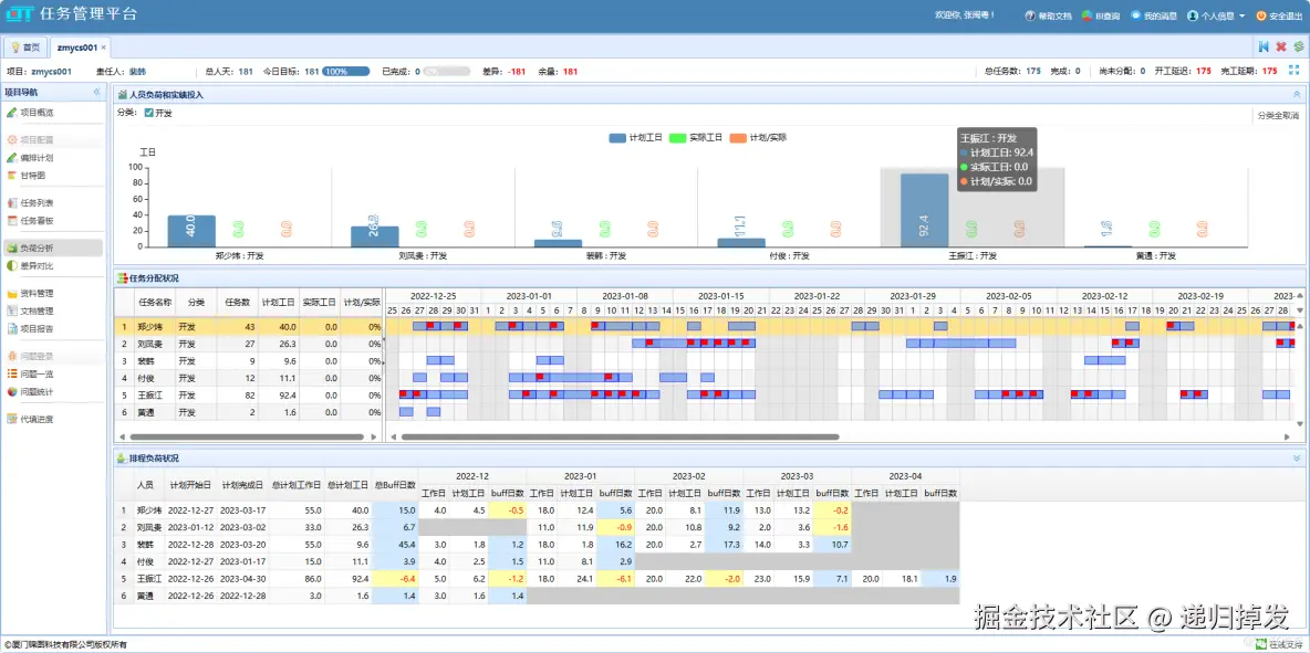 比如,在某个软件开发项目中,从图表上能看到开发人员王振江的计划工日为 92.4,实际工日却显示为 0,这就提示管理者,王振江可能尚未投入到实际工作中,或者工作进度严重滞后,需要进一步沟通了解原因,及时调整任务安排。