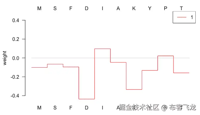 plot()预测特征:该特征展示了每个氨基酸对整体决策的贡献,并增加了学习结果的可解释性。在这里,第四个残基D对该蛋白质的决策贡献非常大。通过在多个序列中检查这种贡献模式,可以阐明影响决策的模式。值得注意的是,你可能会看到与以下示例略有不同的图像——这是由于算法中的随机过程——这是你应纳入分析的一部分:确保任何显著差异不是由于运行代码时的随机选择造成的。在这个例子中,最强的贡献依然应来自于"D":