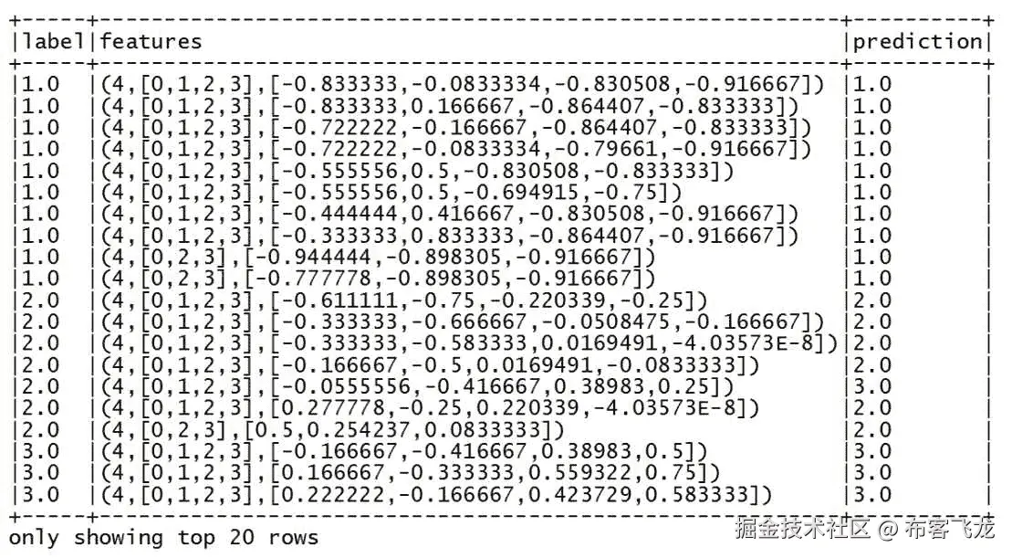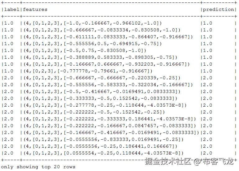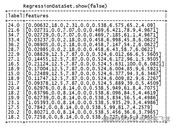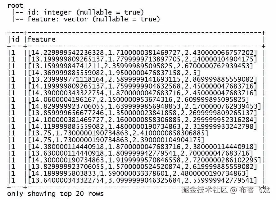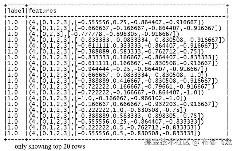 接下来,我们过滤了头行,并将感兴趣的字段从字符串转换为双精度,然后将双精度数据集转换为具有新features字段的新 DataFrame。
