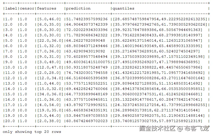 然后,我们创建了AFTSurvivalRegression对象并设置了分位数参数,并通过调用fit(data)函数让模型自行运行。