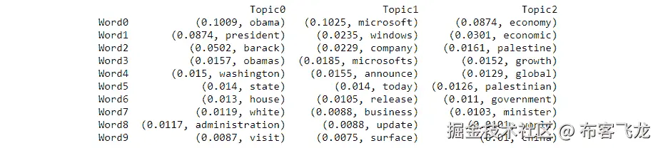 transform,以获取主题-文档分配。打印数据的形状和示例:nmf_transform = nmf.transform(clean_vec2) print(nmf_transform.shape) print(nmf_transform)输出结果如下: