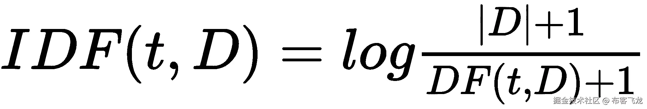让我们用 TF(t, d) 来表示词频,即一个词 t 在文档 d 中出现的次数。我们还可以用 DF(t, D) 来表示文档频率,即包含该词 t 的文档数量,在我们的语料库 D 中。然后我们可以定义逆文档频率 IDF(t, D) 如下: