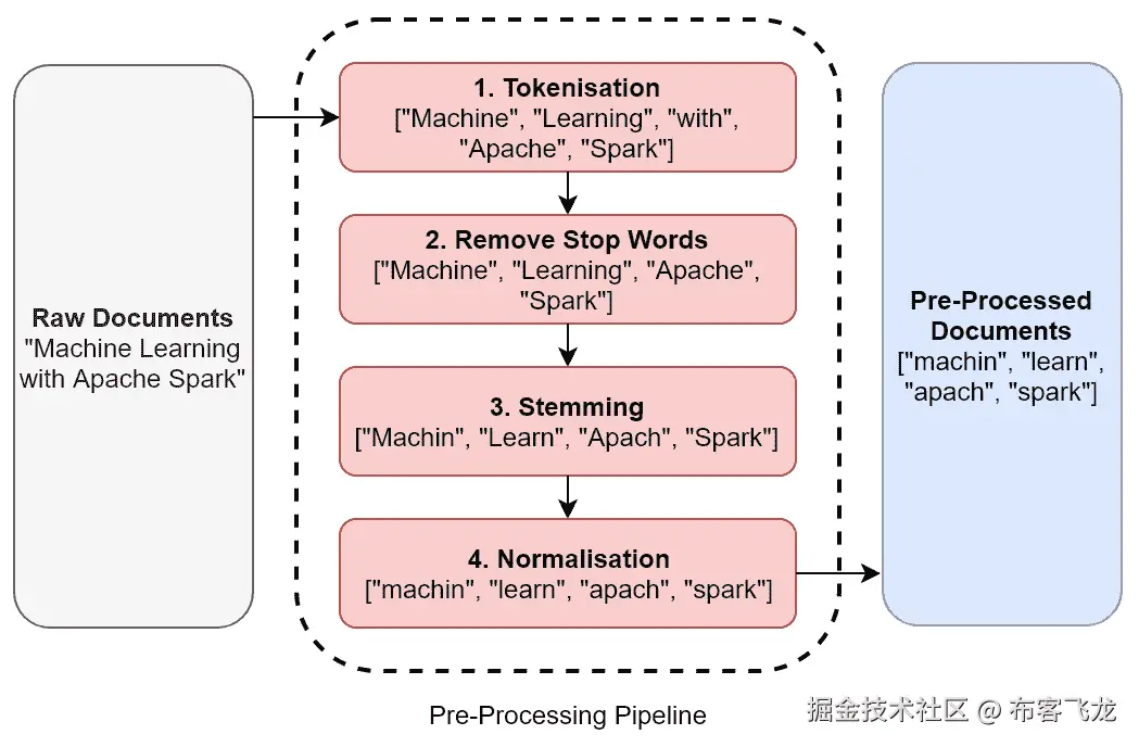 停用词是在给定语言中常用的单词,用于结构化句子语法,但它们在确定其潜在意义或情感方面不一定有帮助。例如,在英语中,常见的停用词包括and、I、there、this和with。因此,一个常见的预处理技术是通过基于特定语言的停用词查找来过滤这些单词,从而从标记集合中移除它们。使用我们之前的例子,我们的过滤标记列表将是["Machine", "Learning", "Apache", "Spark"]。