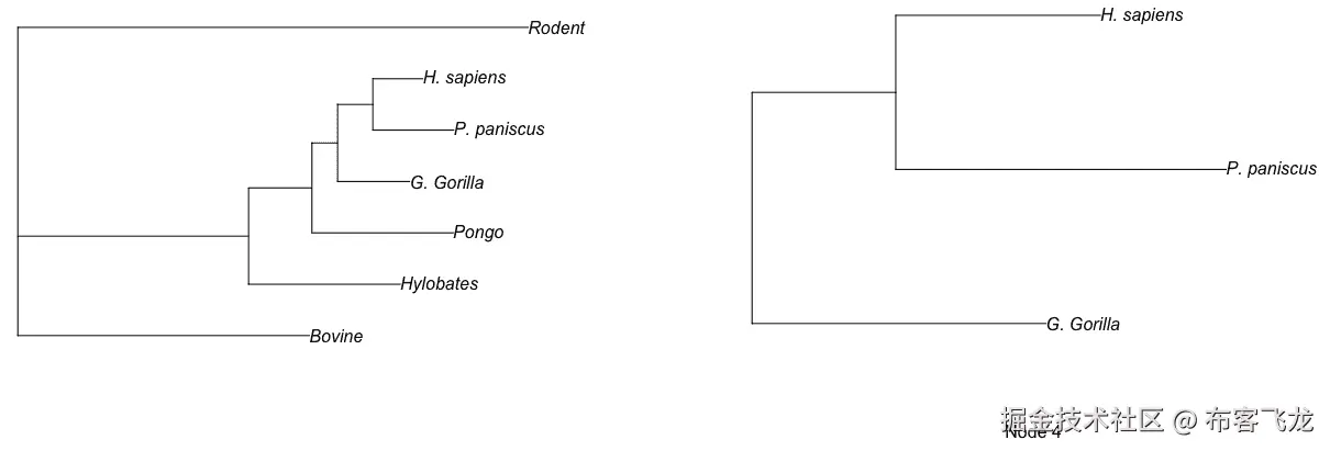 系统发育分析是生物学和生物信息学的基石。相关程序种类繁多且复杂,计算耗时,数据集通常庞大。许多程序是独立运行的,且拥有专有的输入和输出格式。这形成了一个复杂的生态系统,我们在处理系统发育数据时必须应对,意味着通常最简单的策略是使用多种工具组合来加载、转换并保存分析结果,以便能够在不同的软件包中使用它们。在这个操作中,我们将探讨如何在 R 中处理系统发育树数据。迄今为止,R 对各种树格式的支持较为有限,但一些核心包具有足够标准化的对象,工作流可以集中在少数几种类型上,且转换为这些类型的过程已经简化。我们将使用ape和treeio包来导入和导出树数据。