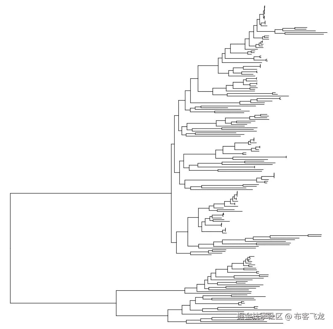 ggtree()创建一棵基本的树。这是一个封装了较长ggplot样式语法的函数,具体来说是ggplot(itol) + aes(x,y) + geom_tree() + theme_tree()。因此,可以将所有常见的ggplot函数作为额外层叠加到图表中。此步骤中的代码将生成以下图: