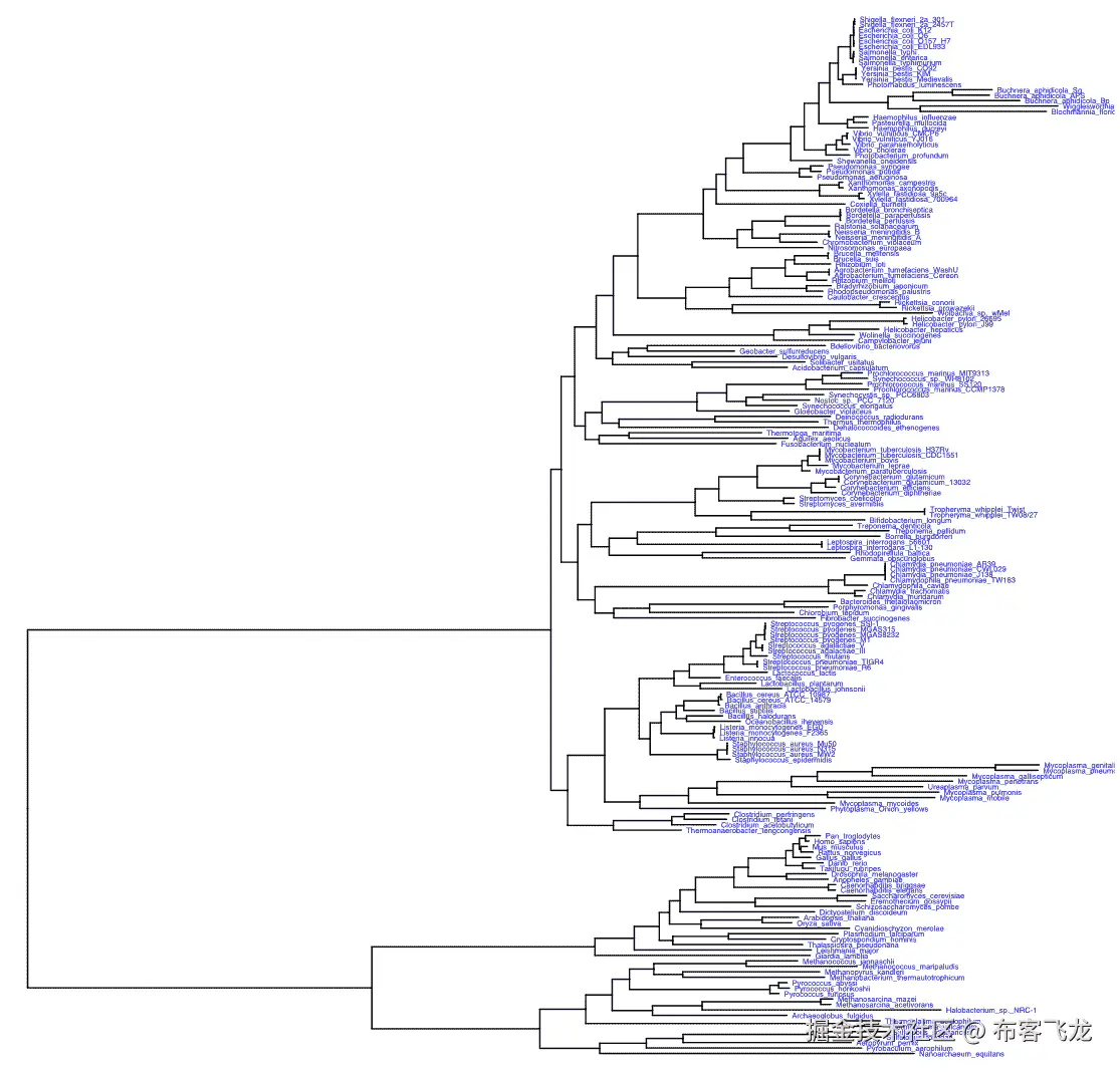 ape的read.tree()函数。请注意,在后续步骤中,我们不需要为ggtree创建treedata对象;从read.tree()返回的phylo对象完全可以传递给ggtree()。 -