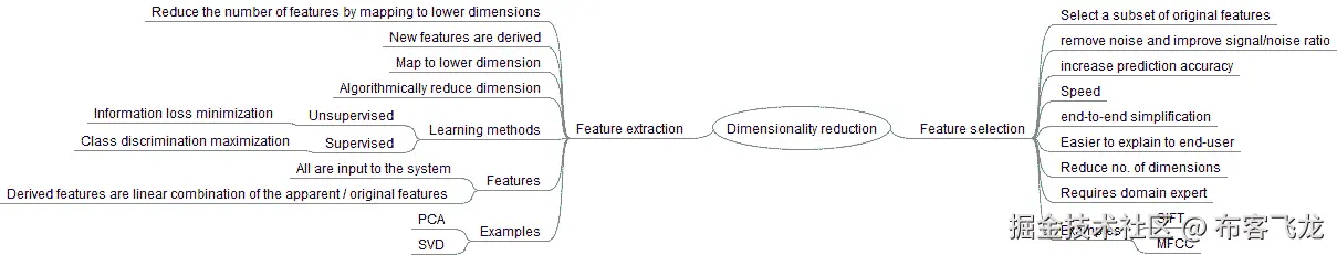 我们有两个选择,特征选择和特征提取,可以用来将维度减少到一个更易管理的空间。这些技术各自是一个独立的学科,有自己的方法和复杂性。尽管它们听起来相同,但它们是非常不同的,需要单独处理。