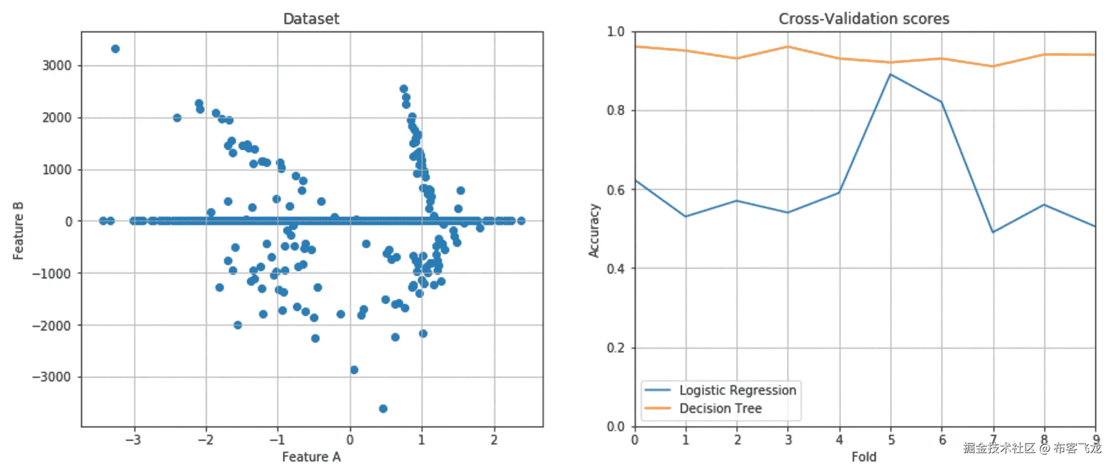 二进制决策树是一种基于顺序决策过程的结构。从根节点开始,评估一个特征并选择两个分支中的一个。这个过程会重复进行,直到达到一个最终的叶子节点,它通常代表我们寻找的分类目标。与其他算法相比,决策树在动态上似乎更简单;然而,如果数据集在保持内部平衡的同时可以分割,整个过程在预测上既直观又相对快速。此外,决策树可以有效地处理未归一化的数据集,因为它们的内部结构不受每个特征所取值的影响。在下图中,有未归一化的二维数据集的图和用逻辑回归和决策树获得的交叉验证分数: