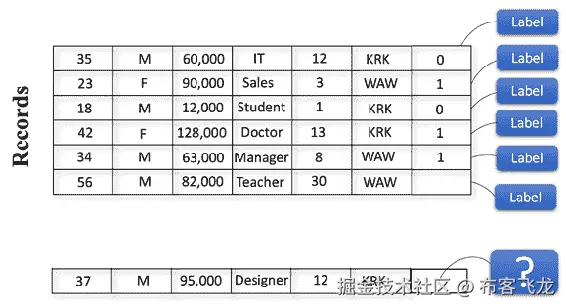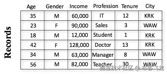 让我们用一个例子快速回顾一下监督学习。 在训练机器学习算法时,您可以通过提供标签来观察和指导学习。 考虑下面的数据集,其中每一行代表一个客户,每一列代表一个不同的特征,例如年龄,性别,收入,职业 ,任期和城市。 看看这个表: