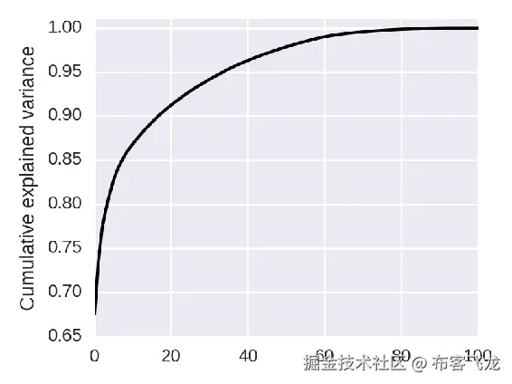 我们可以看到,主成分解释了大约 67%的方差,累积解释率在小于 40 成分时很快达到 95%,在 61 成分时达到 99%,在 80 成分时几乎达到 100%。这意味着,如果我们只取第一个 80 分量,就足以捕获数据集中几乎所有的方差。这意味着我们应该能够安全地将 1000 多个维度的数据集压缩到 80 个维度。