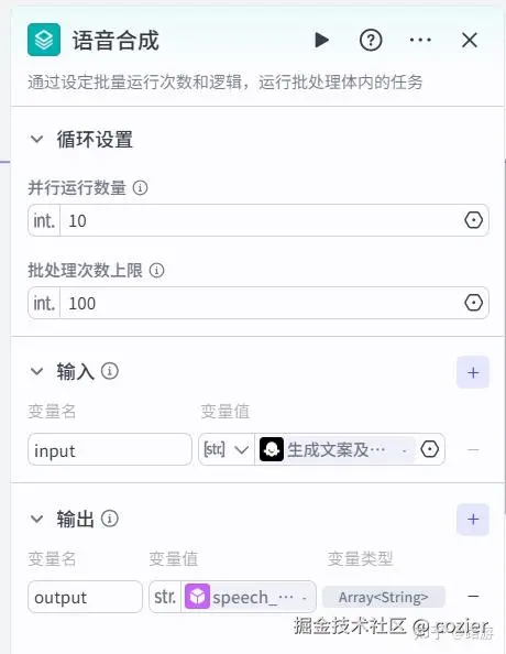 这个节点又是一个循环体,和图片生成类似,根据分镜数组长度以及诗句内容生成朗读音频。