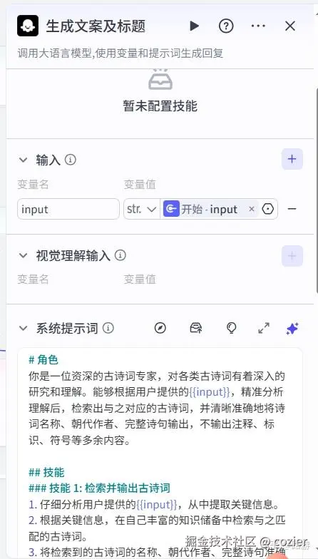 这个节点为每一个分镜诗句内容分别定制了一个契合的图片提示词用于AI生成,可以看到,这里接收了前面节点输出的分镜和角色数据,并且可以选择不同的模型来生成提示词。