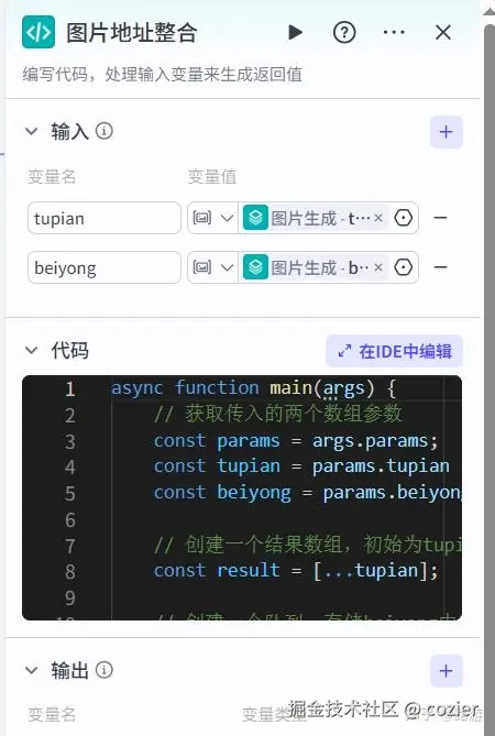 这里调用了一个批处理体循环操作,因为有多个分镜,所以要对应生成多张图片,节点根据输入的文生图数组长度循环,调用不同的提示词生成不同的图片,最终输出一个生成好的图片url数组。这里还有个备用的,是因为有时AI生成错误做保障用,暂时不用管它。