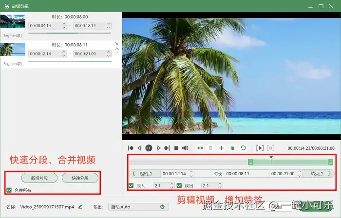 步骤3:录制结束后,无需关闭软件,可以直接利用软件内置的 “高级剪辑” 工具对视频进行后期处理。在剪辑界面中,支持多种基础编辑操作,例如:对视频进行分段,删除录制过程中多余、卡顿的片段等。
