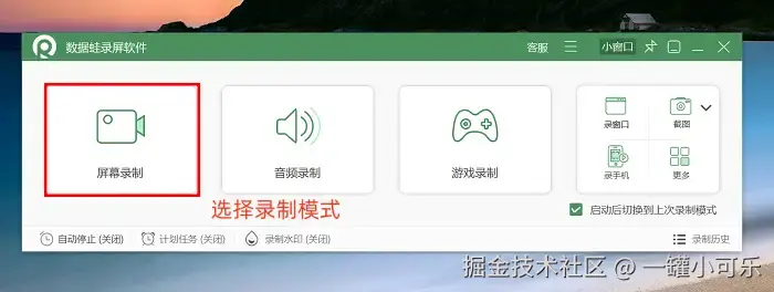 步骤1:首先,将数据 蛙录屏软件打开,软件主界面中涵盖屏幕录制、游戏录制以及摄像头录制等多种类型。本次我们以最为常用的 “屏幕录制” 模式来开展操作,只需轻轻点击该模式的图标,便能顺利进入下一步的设置页面。