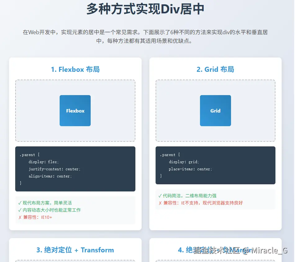 我将为你展示多种实现div居中的方法,每种方法都有其适用场景和特点。