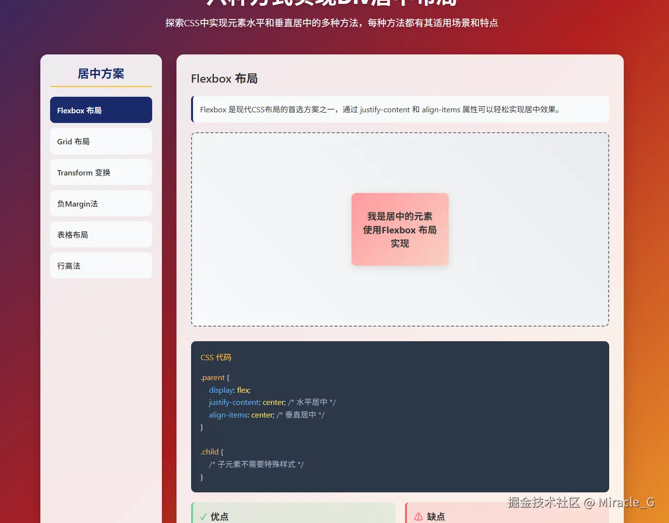 : "我是居中的元素<br>使用" + method.title + "实现";
