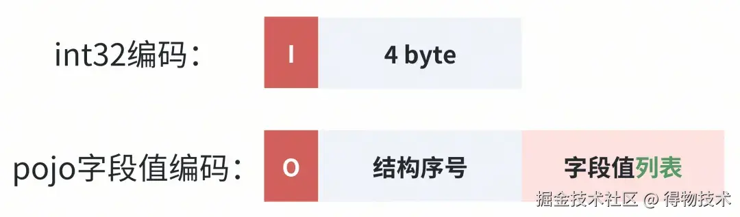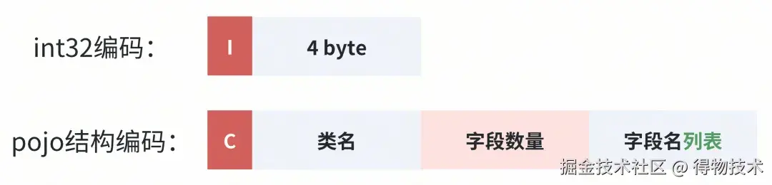 POJO结构的tag为C,对照int32的编码格式,POJO结构的编码格式如下: