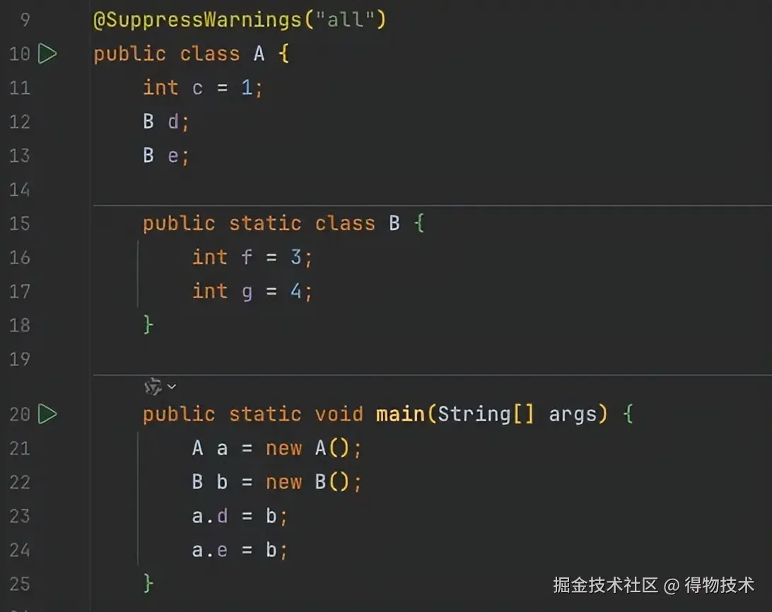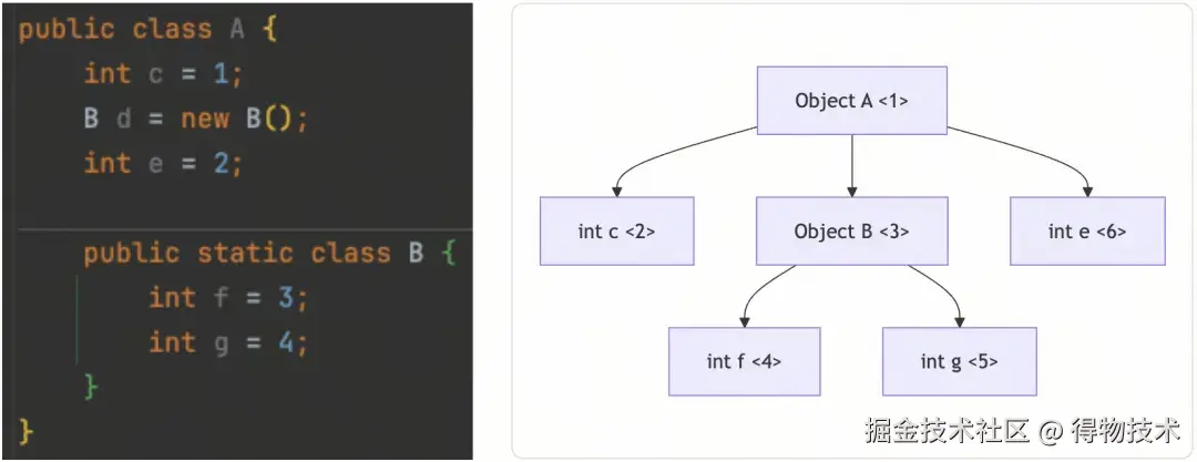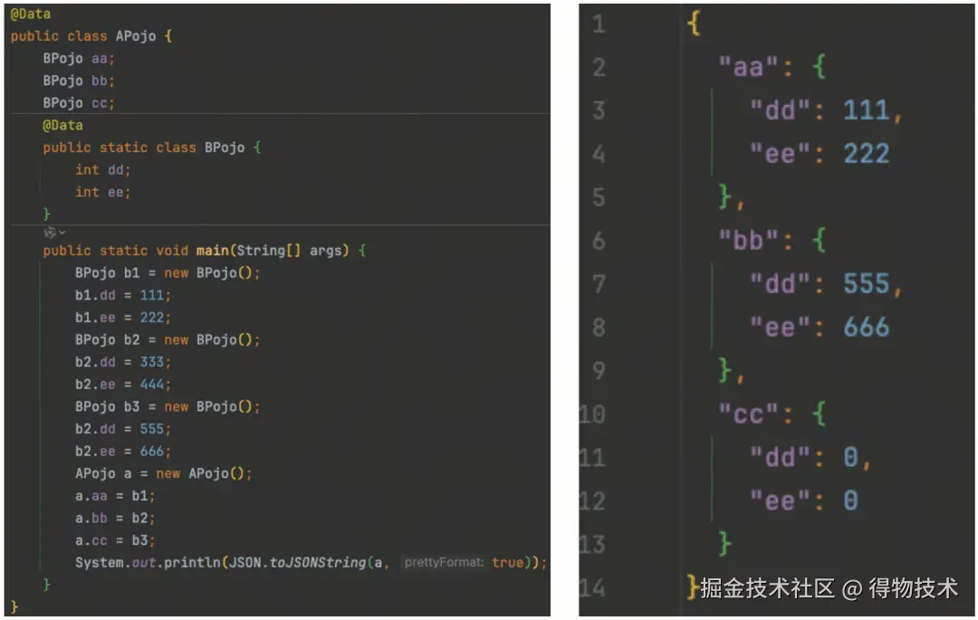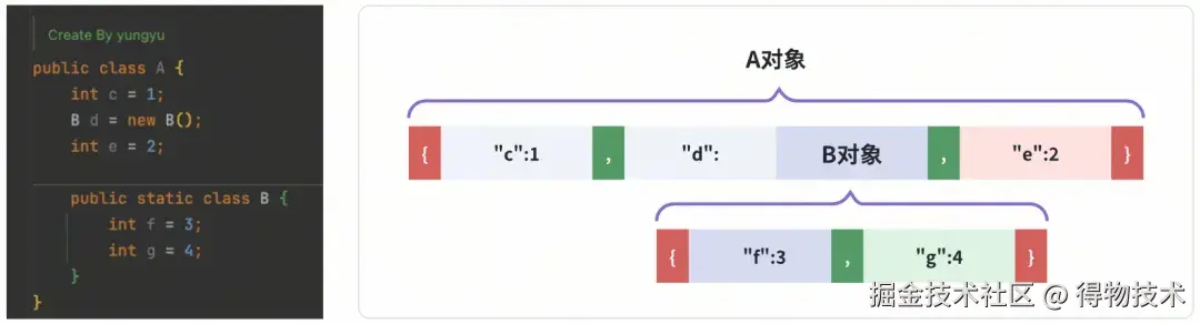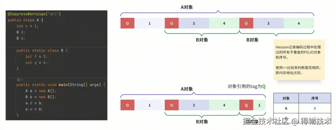 A对象里有两个字段(d、e)指向同一个对象B。如果不做处理,会因为重复编码而带来不必要的开销。