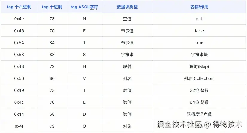 由此延伸、拓展,其他的数据类型都是类似的模式。常见数据类型及其对应的tag值如下: