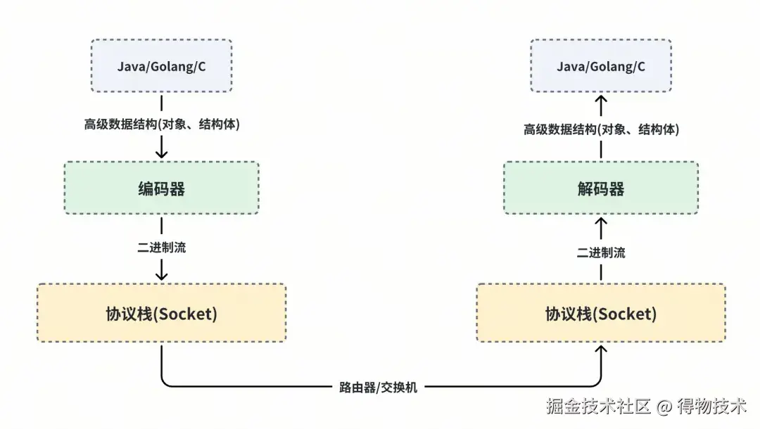 以Java为例,业务逻辑的输入输出都是 【object】 。但在RPC场景中,这些对象必须经由网络传输。这里出现了一个根本性矛盾:网络介质(网线/光纤)对面向对象编程(OOP)一无所知,它们只会用光和电忠实地传输扁平化的字节流(byte[] )。