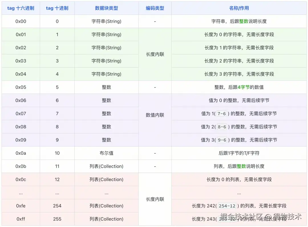 因为tag是一个byte(int8) ,取值范围是0-255,每个tag标识一种特定的数据类型(int、boolean等),但是这些数据类型最多几十种,取值范围内还有很大的数值区间没有被使用,其实比较浪费。那我们就可以把这些空闲的tag值,挪作他用,提升tag数值空间利用率。
