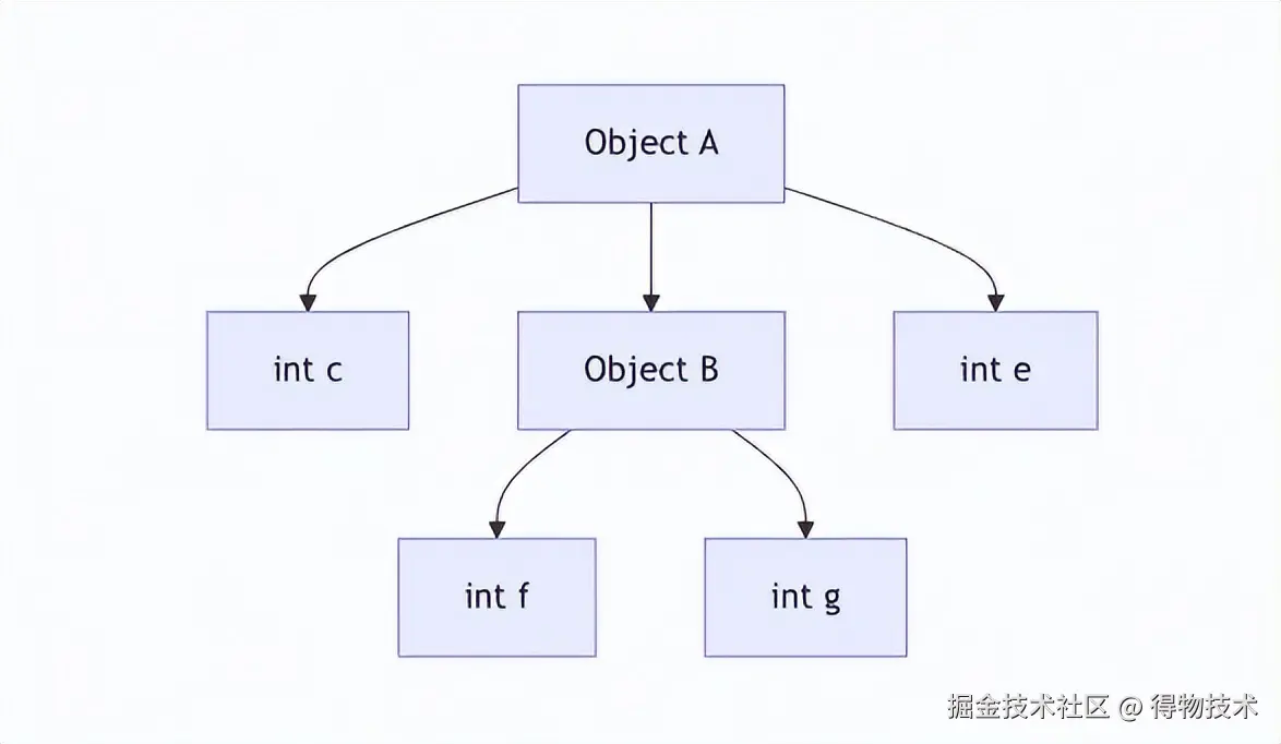 如上图所示,以A对象为根的对象图,一共有6个数据块。