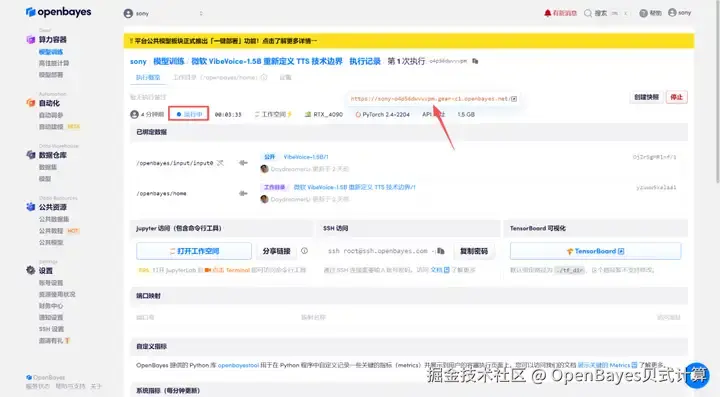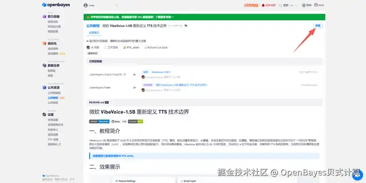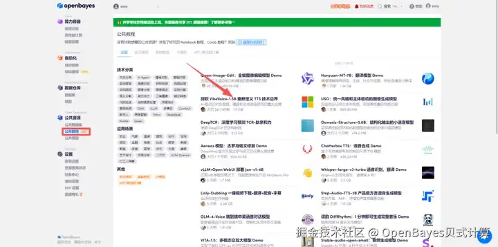 1.登录 OpenBayes.com,在「公共教程」页面,选择「微软 VibeVoice-1.5B 重新定义 TTS 技术边界」教程。