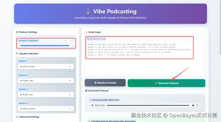 进入模型页面后,在「Number of Speakers」中选择说话人数,「Speaker 1-4」设置说话人,「Conversation Script」中输入对话文本,最后点击「Generate Podcast」生成。