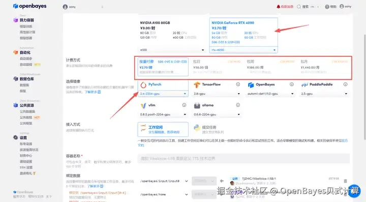 3.选择「NVIDIA GeForce RTX 4090」以及「PyTorch」镜像,按照需求选择「按量付费」或「包日/周/月」,点击「继续执行」。新用户使用下方邀请链接注册,可获得 4 小时 RTX 4090 + 5 小时 CPU 的免费时长!