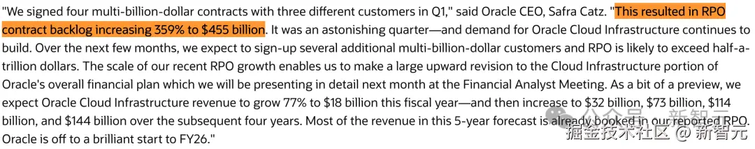 更令人振奋的是,甲骨文 RPO(已签约未计入收入的合同)总金额,在本财季达 4550 亿美元,同比增长超四倍,环比增长超三倍。