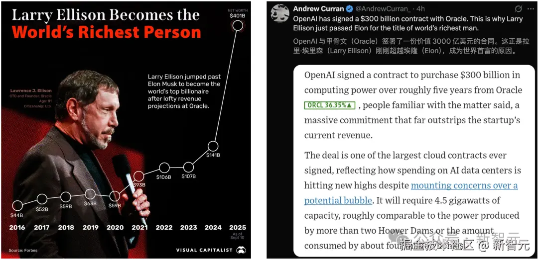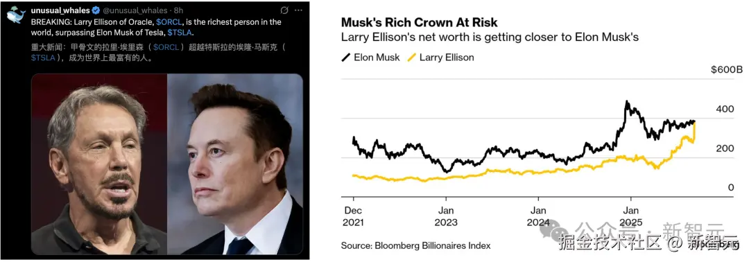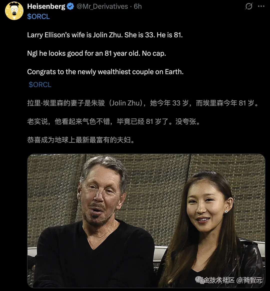 「【新智元导读】昨晚,科技圈炸了!甲骨文创始人身价一夜暴涨超 1000 亿,直接干翻马斯克,登顶世界首富。81 岁老爷子携 33 岁华裔太太 Keren Zhu,新晋「全球最壕夫妇」。值得一提的是,甲骨文市值飙破 9000 亿,直逼万亿俱乐部。」